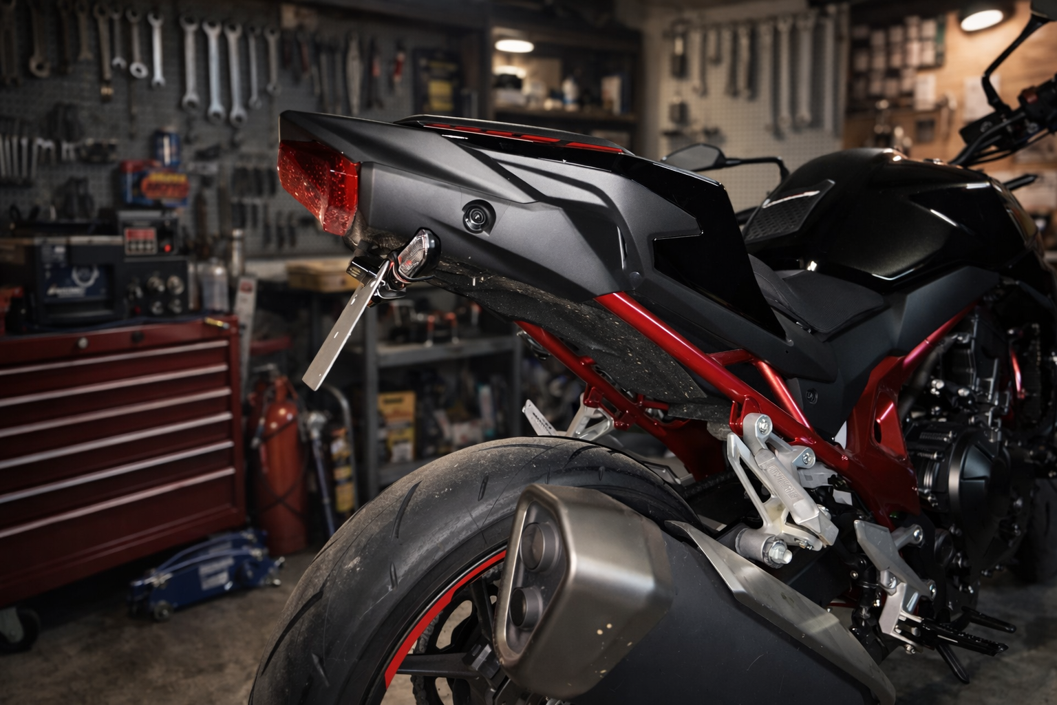 Grâce à notre système de connectique dédié, vous pouvez remplacer votre support de plaque d’origine par un support plus court, plus esthétique et plus agressif, sans modification complexe du faisceau d’origine.